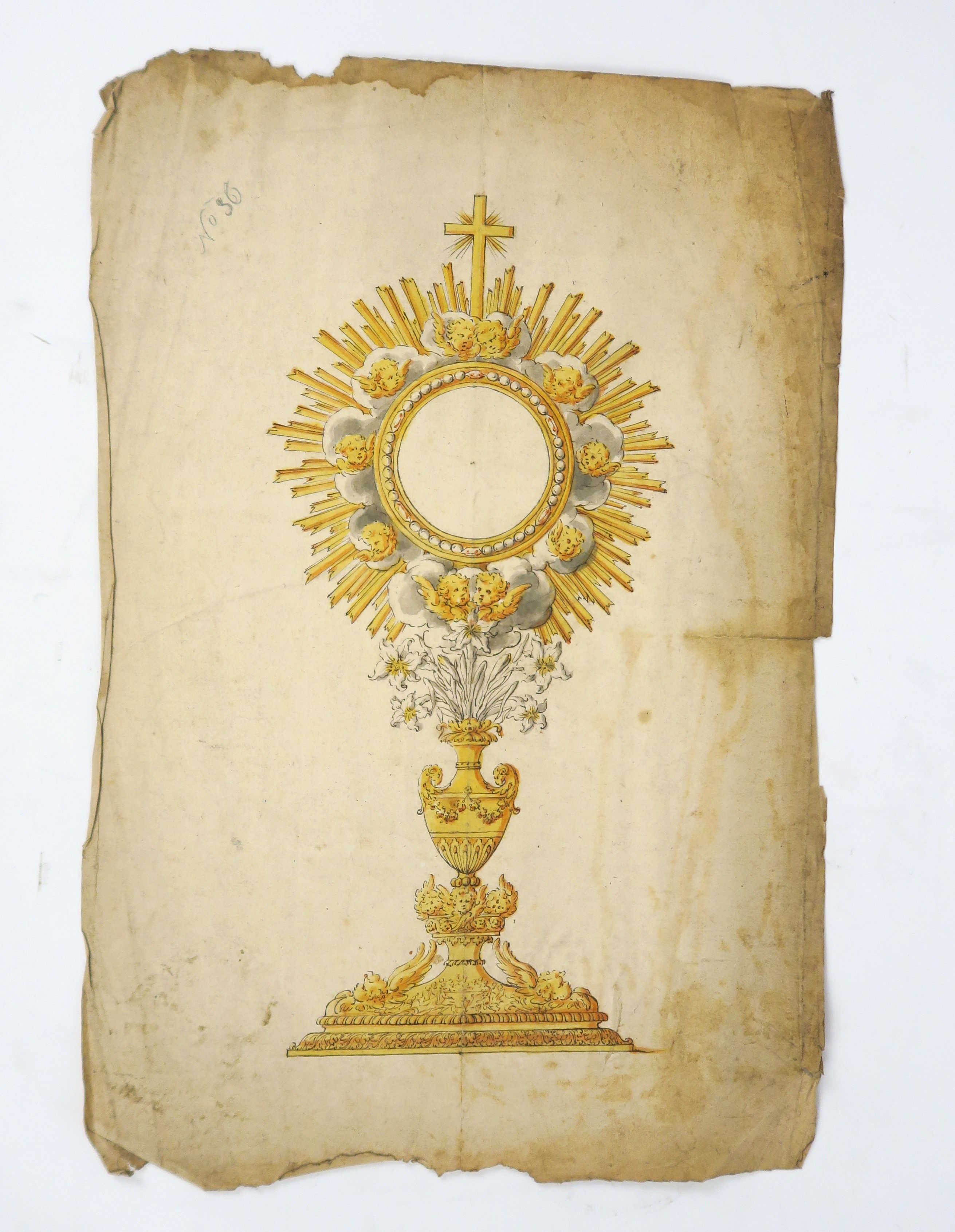 Ecole française début XIXème « Projet d’ostensoir » Dessin au lavis et aquarellé. 41.5 x 27.5 cm (accidents) On y joint - un ensemble 3 projets d’ostensoirs Dessins et dessin aquarellé. 67.4 x 28.5 cm - 59 x 31 cm - 34.2 x 23.5 cm - un ensemble de 10 projets d’encensoirs, certains XVIIIème. Dessins au lavis et à la sanguine. Dont PARAUD.