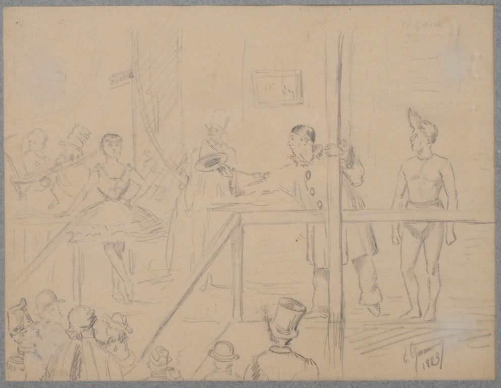 Ecole française fin XIXème. "les saltimbanques" Dessin au crayon, signé en bas à droite. Dim. 18,5 x 24,5 cm
