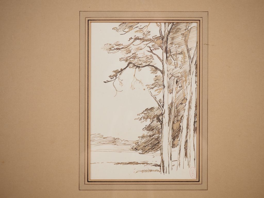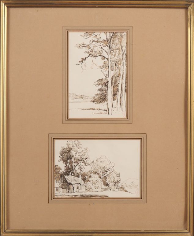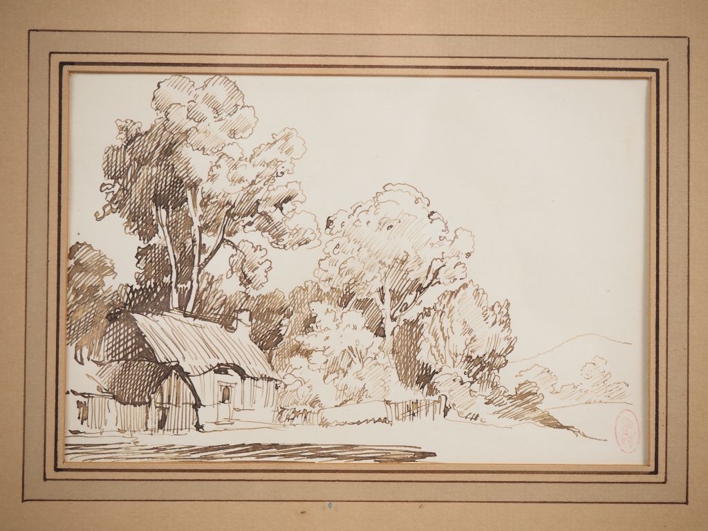 Ecole française fin XIXème. Paire de dessins dans un même encadrement "paysage" et "ferme" Cachet de tampon d'atelier