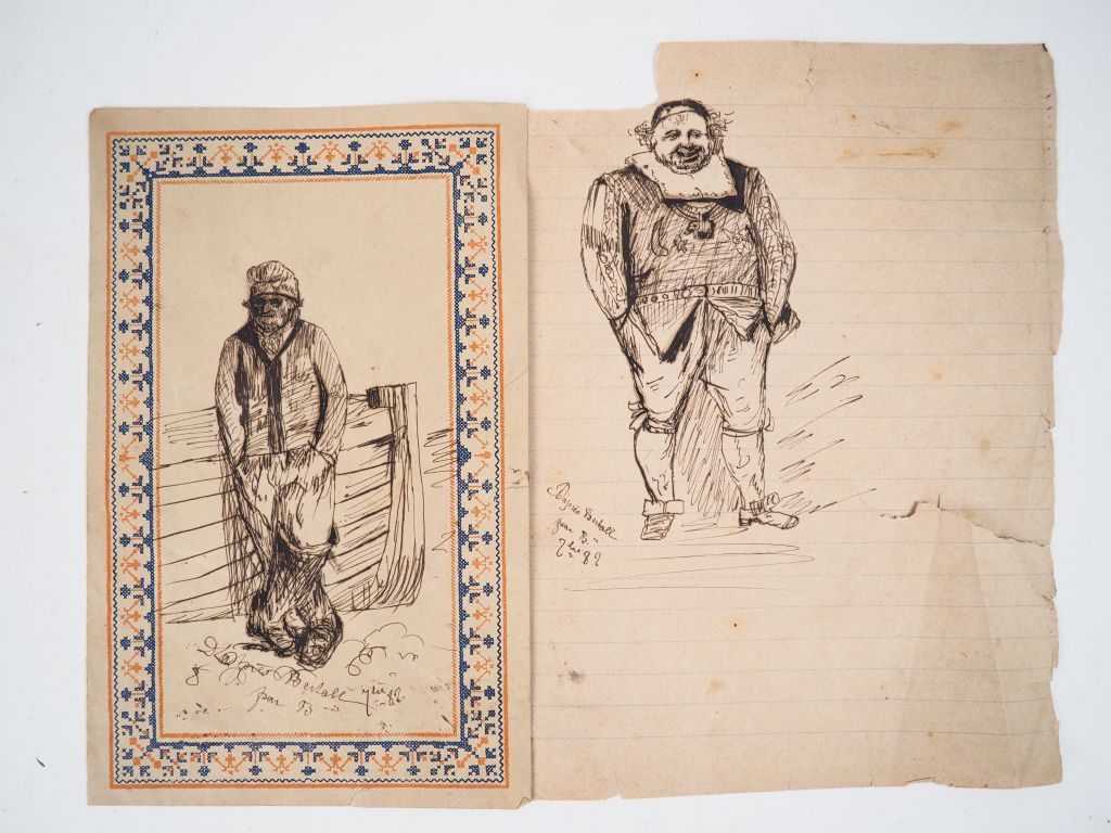 Ecole française XIXème. "Etudes de personnages". 2 dessins signés en bas à gauche. Dim. 19 x 15 cm. Dim. 1' x 7,5 cm. (Mauvais état pour l'un).
