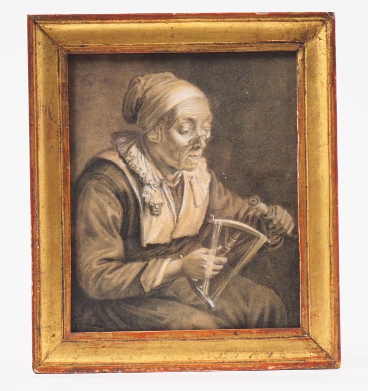 Ecole française XIXème. "La fileuse". Dessin rehaussé, trace de signature en bas à gauche. Dim. (à vue) : 15,5 x 12,5 cm.