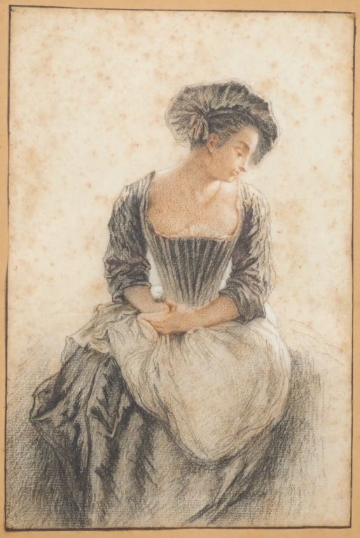 Ecole française XIXème. "Portait de dame à la robe noire". Dessin. Dim. (à vue) : 24 x 16 cm. (Petites rousseures).