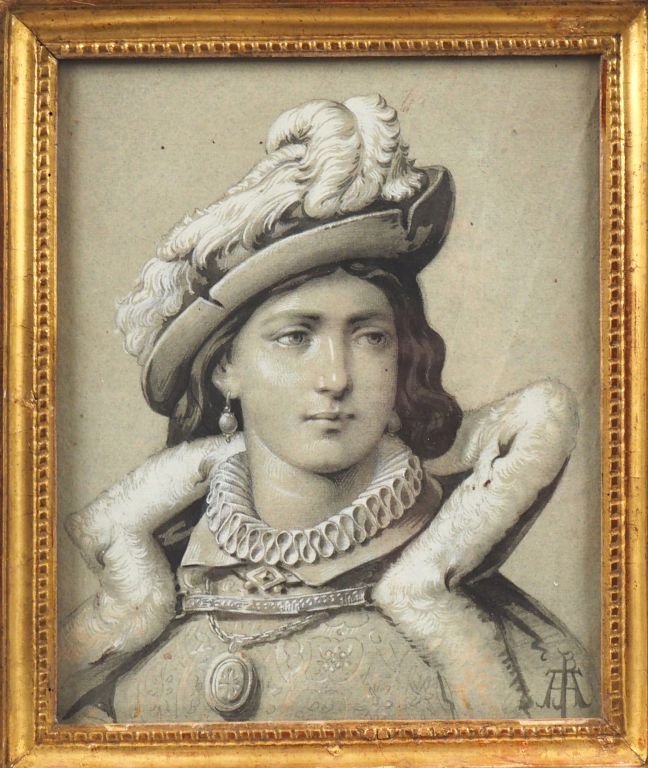 Ecole française XIXème. "projet de vitrail". Dessin réhaussé monogramé en bas à droite. Dim. 29,5 x 24 cm.
