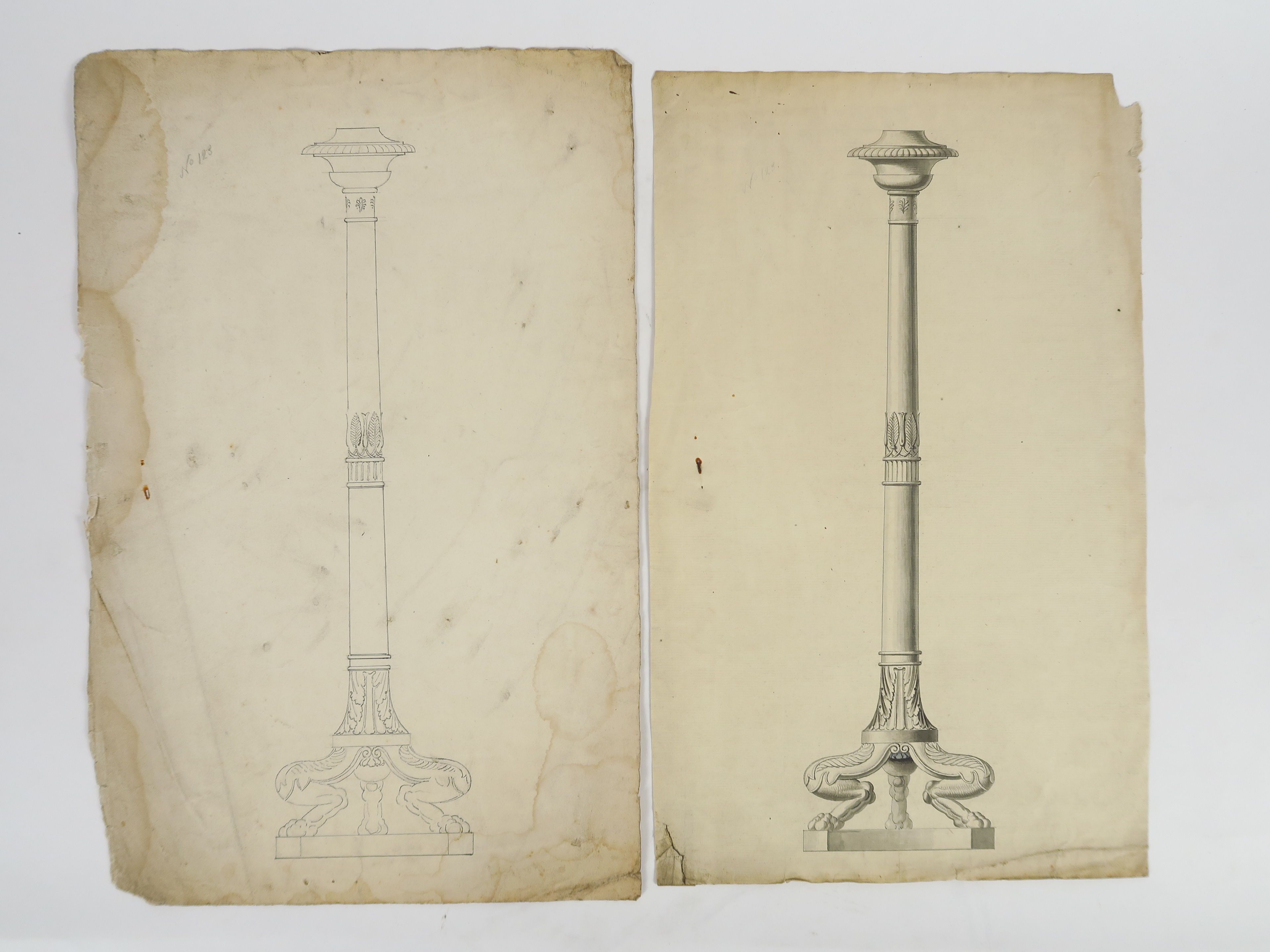 Ecole française XIXème « Projet pour un chandelier » Deux dessins pour un même projet. 47.5 x 30.5 cm 45.5 x 28.2 cm (tâches et pliures) Ecole française XIXème « Projet pour un chandelier, à décor de bustes de femmes » Deux dessins pour un même projet. 33 20.5 cm 39 x 25 cm