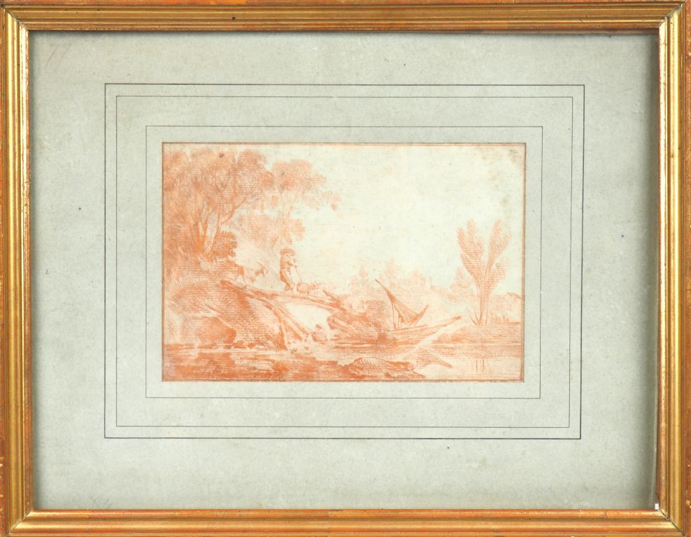 Ecole française XVIIIème. "paysan berger et ses chèvres" Dessin à la sanguine, signé en bas à gauche Dim. à vue : 13 x 19 cm