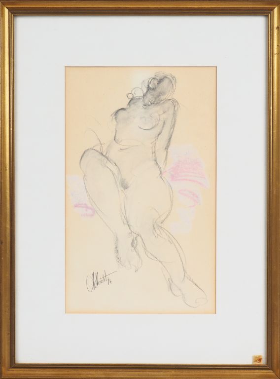 Ecole française XXème. "Odalisque moderne". Dessin rehaussé signé en bas à droite et daté 1984. Dim. (à vue) : 26,5 x 16 cm.