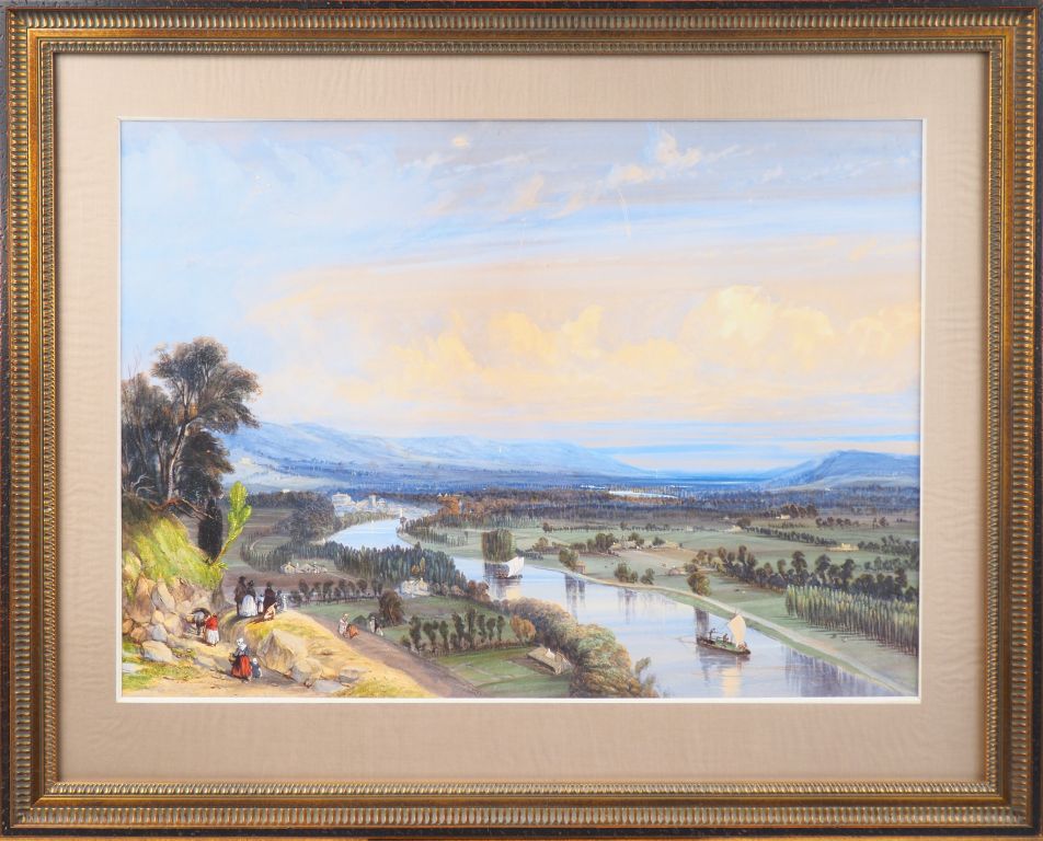 Ecole italienne début XIXème. "Paysage fluvial animé". Grande gouache sur papier. Dim. (à vue) : 57x 79 cm.