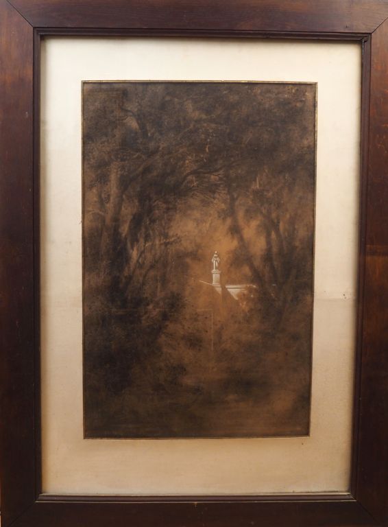 Emile HERISSAY. « Statue dans un parc » Dessin au fusain rehaussé de craie. Monogrammé en bas à gauche et daté 1874. 83 x 53.5 cm