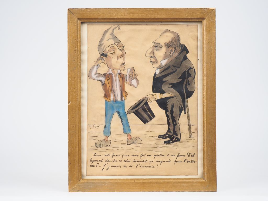 Gustave FRISON. "Caricature". Aquarelle signée en bas à gauche, accompagnée d'un texte humouristique. Dim. (à vue) : 27,5 x 20 cm.