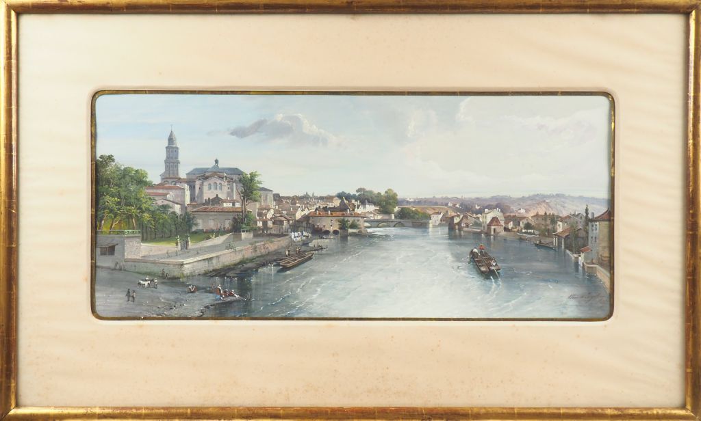 Jean-Jacques ALBAN DE LESGALLERY. "Vue de Périgueux". Aquarelle gouachée, signée en bas à droite et datée 1857. Dim. À vue) : 39 x 92 cm.