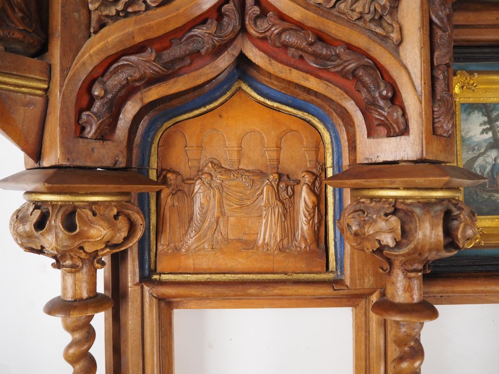 Louis LIOT. "Vie de Saint Bruno". Suite de 9 aquarelles, personnages en léger relief, dans des encadrements en laiton doré sous verre, enchassées dans un haut de retable Napoléon III de style Haute époque à décor sculpté. Signées et datées 1729. (Manques). Dim. (aquarelles à vue) : 9 x 7 cm. Dim. (totale) : 150 x 105 cm