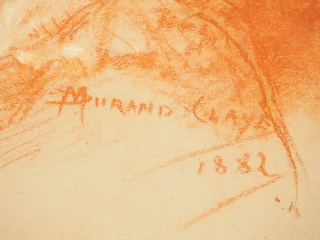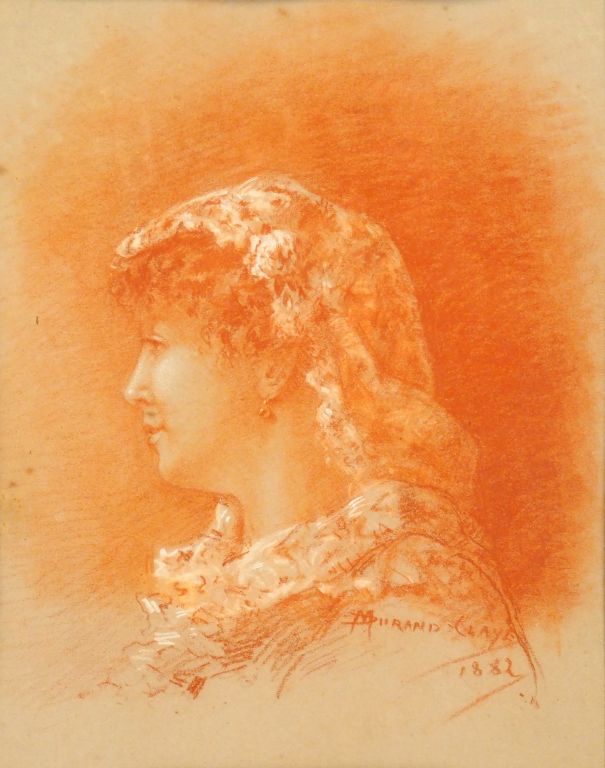M. DURAND CLAYE. « Portrait de jeune femme de profil » Dessin à la sanguine rehaussée de craie. Signé en bas à droite et daté 1882. Dim. 29 x 22.5 cm