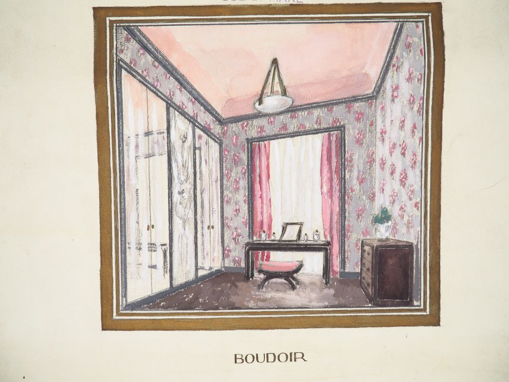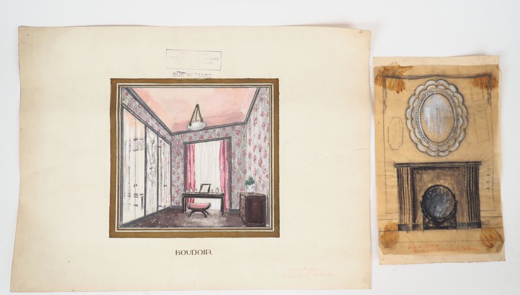 Maurice LE POITEVIN pour SUE et MARE. Projets pour un salon et un boudoir. 2 dessins aquarellés et gouachés. L'un porte le tampon de la Compagnie des Arts Français. Dim.46 x 60 cm. Dim. 36 x 22,5 cm.