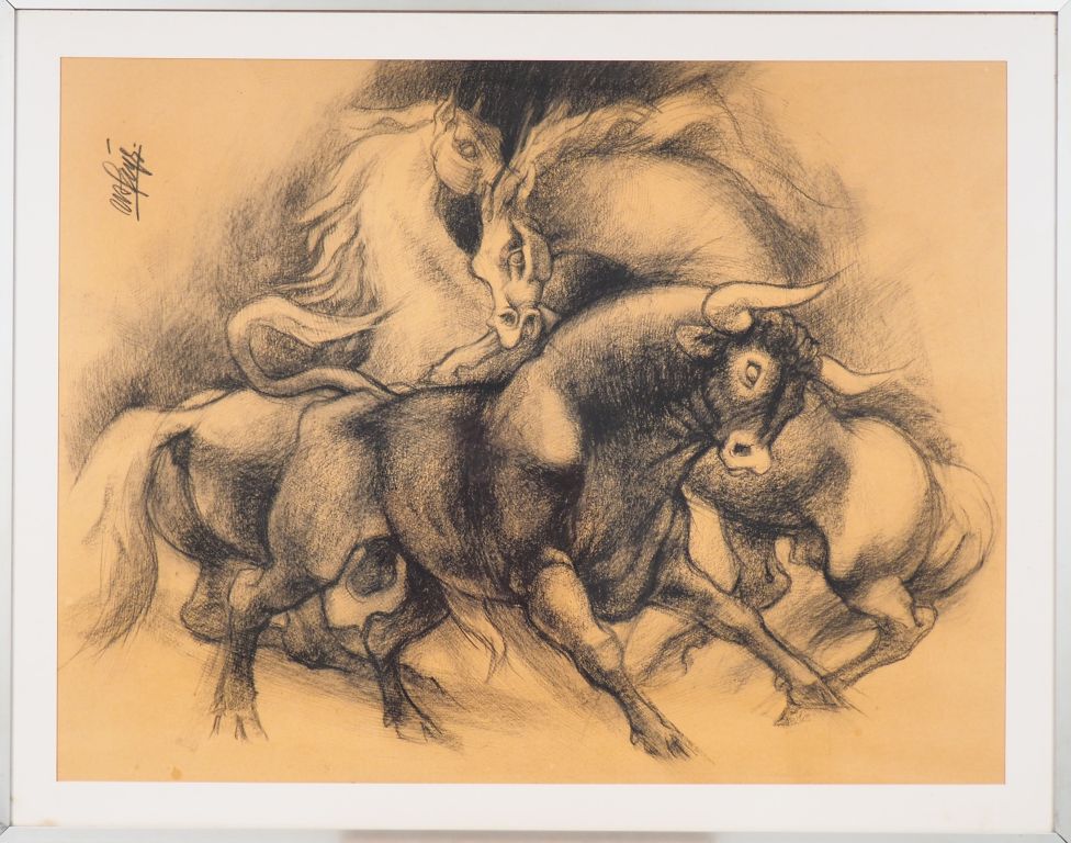 PAGES. "Taureau de combat et chevaux". Dessin signé en haut à gauche. Dim. (à vue) : 61 x 80 cm.