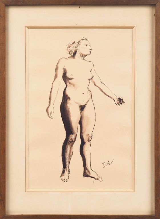 René ICHE. "Etude de nue". Dessin à l'encre, signé en bas à droite. Di...