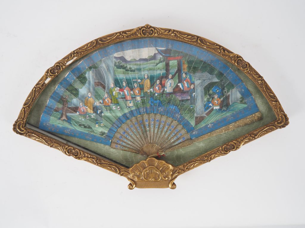 Canton. Eventail 1900 à feuilles pliées 16 brins et 2 maitre brins, base en métal vermeillé, filigranné et émaillé, à décor polychrome de personnages sur fond de paysage. (quelques usures) Dans un cadre adapté.