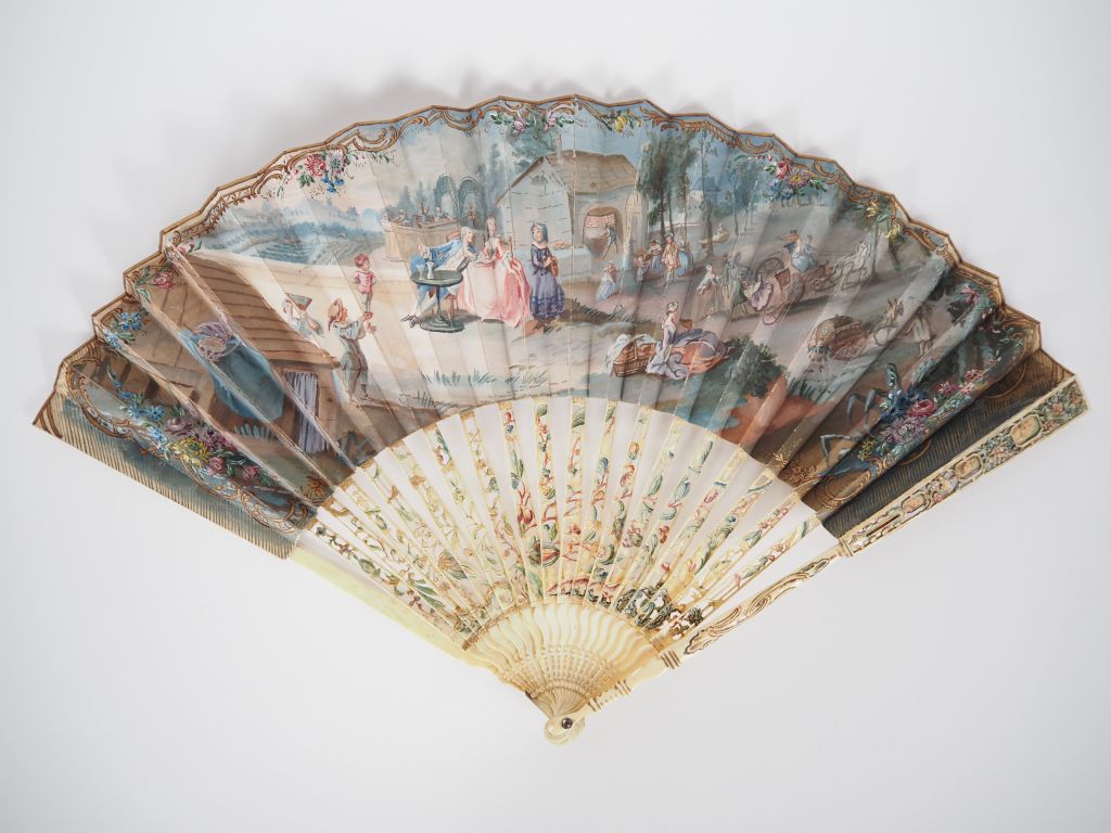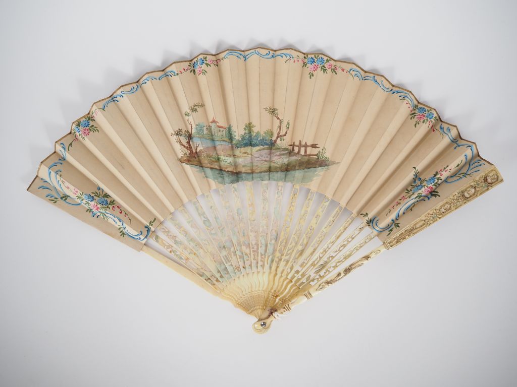 Eventail Louis XV à 20 brins. Monture de type squelette en ivoire ciselée, repercée à décor de branches fleuries. Maîtres Brins, Panache à Transformation de 3 médaillons visages femmes et hommes. Feuille gouachée à décor d'une scène de la vie paysane. Cadre rinceaux fleuris. CITES.
