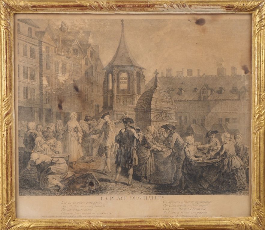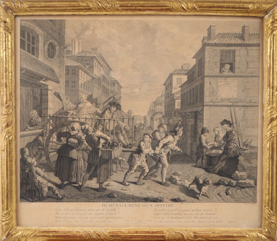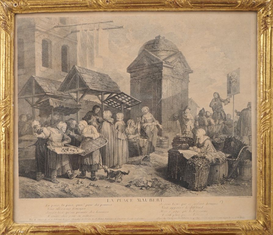 4 gravures de style Louis XVI dans des cadres à baguettes dorées "la place des halles" "la place Maubert", "enlèvement de police" "déménagement d'un peintre". Dim. des cadres : 41 x 46,5 cm