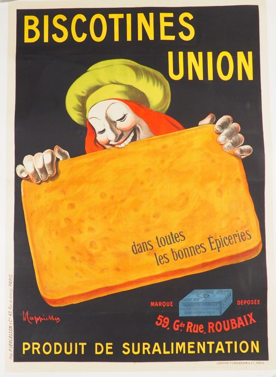 BISCOTINES UNION. Affiche par Lenonetto Cappiello, imprimerie Vercasson, 1906. Condition : A- Entoilée. Dim. : 140x100 cm. 850/950