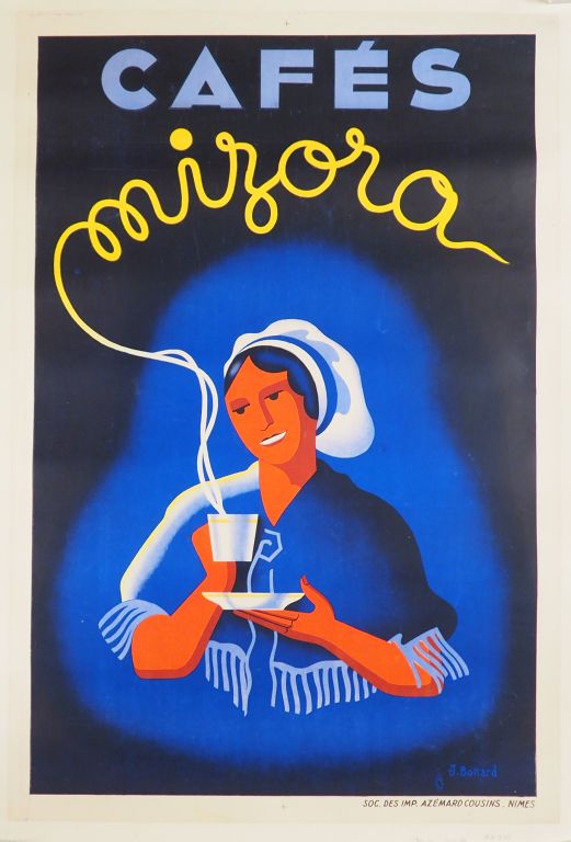 CAFÉS MIZORRA. Affiche par J. Bonard, imprimerie Azémard Nimes, 1935. Condition : A Entoilée. Dim. : 119x81 cm.