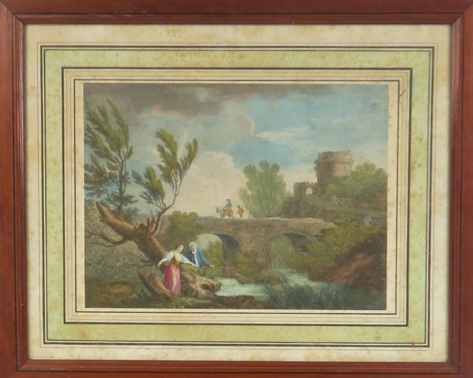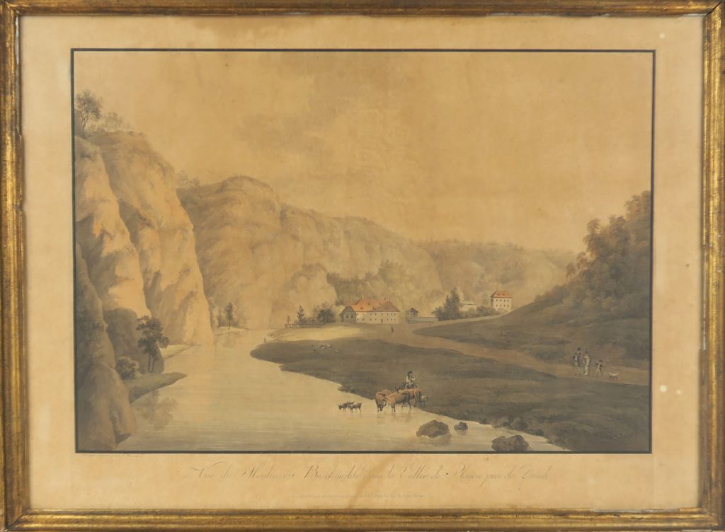 Gravure en couleurs XIXème par Wizani. "vue du moulin dit Buschmuhle dans la vallée de Plauen près de Dresde" On y joint 3 gravures début XIXème en couleurs. "paysages aux ruines" dans des cadres en pitch pin fileté