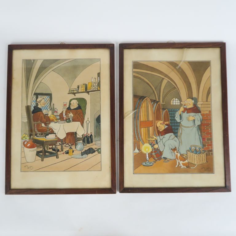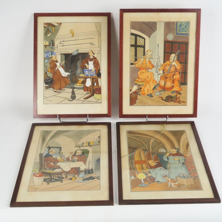 Harry ELIOTT. Suite de quatre lithographies en couleur "les moines bons vivants et musiciens" (un verre cassé)