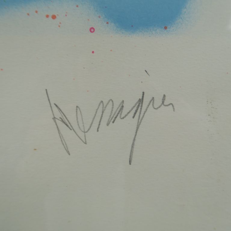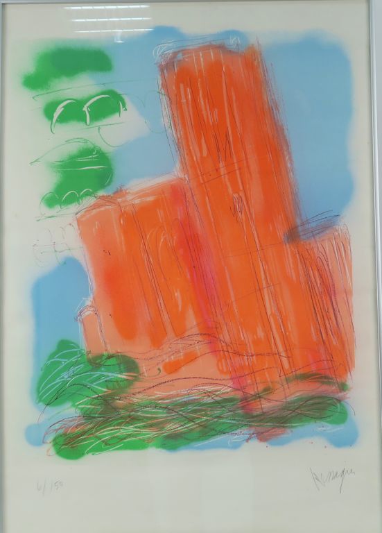 Jean MESSAGIER. "Architecture". Grande lithographie contresignée en bas à droite et numérotée 6/150. Dim. (à vue) : 90 x 63 cm.
