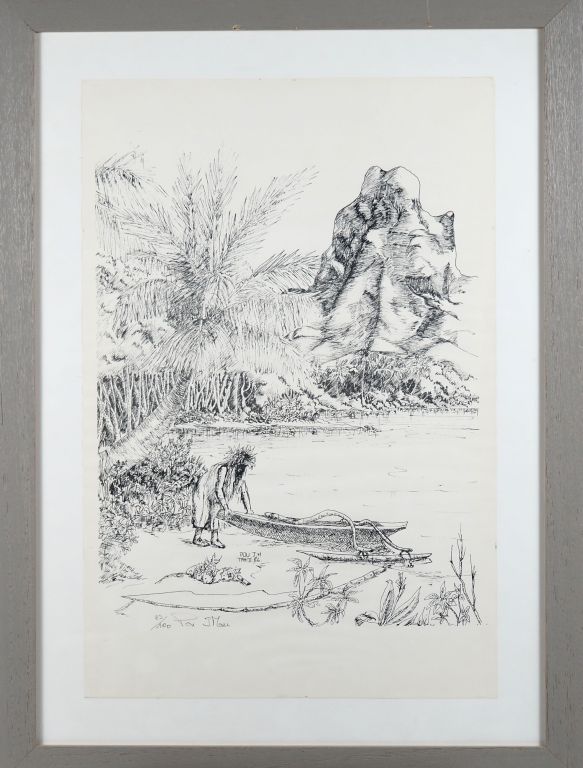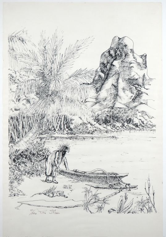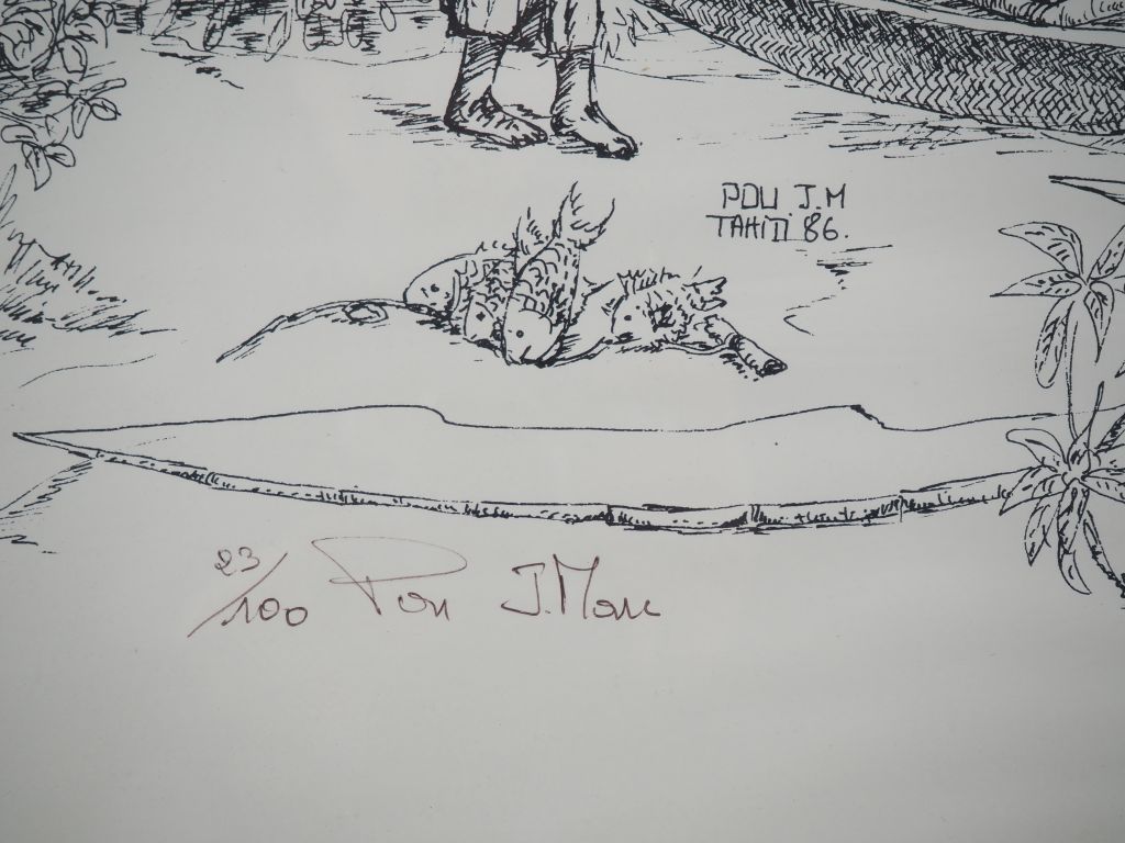 JM. POU. (peintre de Tahiti) "vue animée de Tahiti" Lithographie, en noir numérotée 23/100