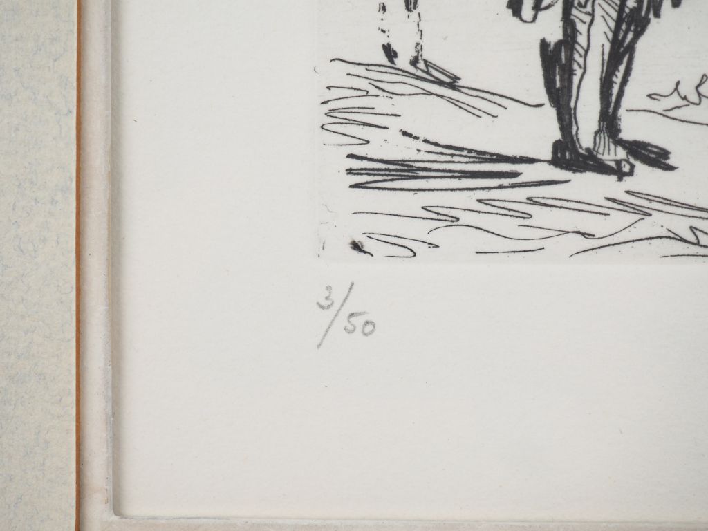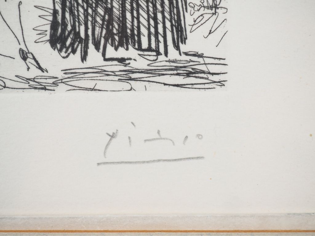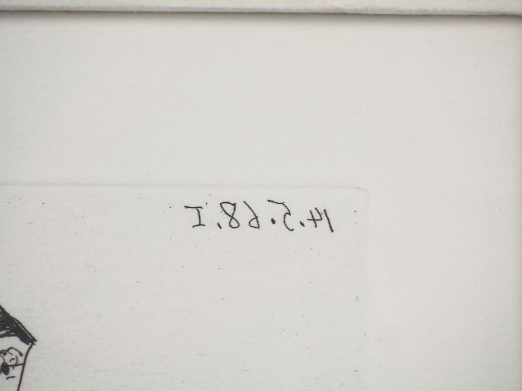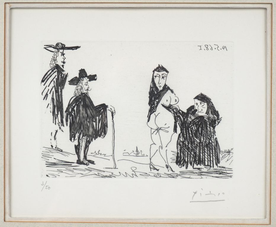 Pablo PICASSO. "La Célestine en action". (Suite Les 347, pl 83). 14 mai 1968. Eau forte. Bloch 1563 , Baer 1579 B b 1. Epreuve sur vélin, numérotée et signée au crayon. Marges. Tirage à 50 épreuves. Galerie Louise Leiris éd. (1969). Cadre Dim. À vue feuille : 13 x 16 cm Expert : Mme BONAFOUS-MURAT Dim. (à vue) : 44 x 59 cm.