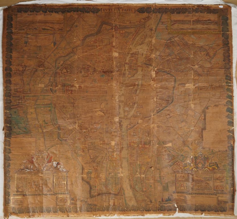 Lot de Plan de Paris XVIIIème rehaussé. Dim. 133 x 139 cm (mauvais état) au prix de 100 à 150 € en vente aux enchères par l'hôtel des ventes Primardeco