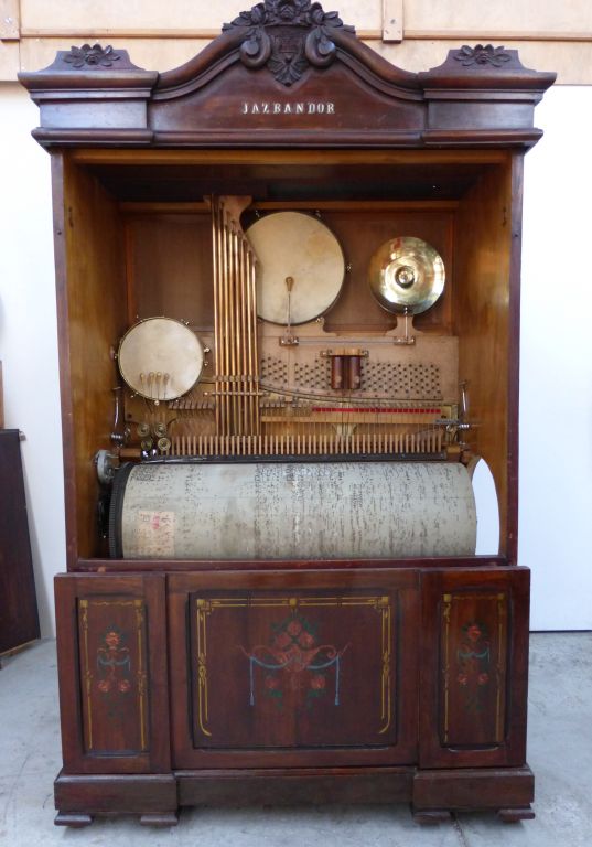 Piano automatique à monnayeur, Modèle JAZBANDOR N° 14839 - 540 - Cadre métallique N° C-14340 , de forme armoire de cinquante-quatre notes, fabriqué après la première guerre mondiale par les successeurs de la veuve de Charles Amelotti. Composition instrumentale Piano à cadre métallique, cordes croisées avec un sommier supérieur découvert non tourillonné, joué par un clavier de 39 notes , équipé d’un rail de sourdine manuel. Ensemble de percussions à commandes débrayables : • Caisse claire à quatre baguettes, couplées à des sistres, • Grosse Caisse et cymbale à une baguette commune, • Wood-block à deux tons et deux baguettes, • 8 Cloches tubulaires frappées chacune par un marteau. Mécanique Ce piano automatique fonctionne à l’aide d’un moteur à ressort classique. Le remontage se fait par manivelle, sur le côté. Le déclenchement se fait par un monnayeur à bascule, venant bloquer la rotation du régulateur à boule au sommet du moteur. En parfait état de fonctionnement. Il a bénéficié de l’avancée du réseau de distribution électrique, ce qui fait qu’il a aussi été entrainé par un moteur électrique, monté en parallèle au système mécanique et commandé par une série de commutateurs encore présents. Cylindre mémoire Cylindre interchangeable d’origine de cinq cent quarante pistes picotées , en parfait état, sans fente visible. Répertoire Liste des dix airs présente dans le porte-répertoire, mais très effacée. Fonctionnement Cet automate musical, restauré en 2012/2013 par la Sarl Le Ludion de Toulouse, est en parfait état Expert : Philippe CRASSE phc@expertises.pro +33 607 151 169