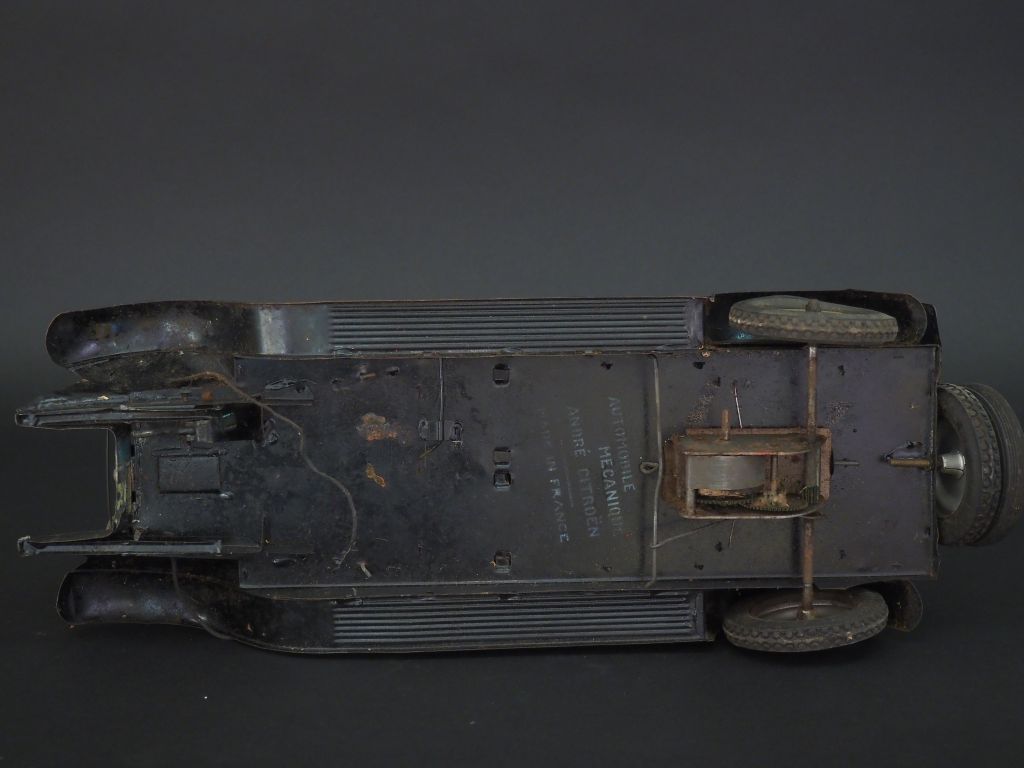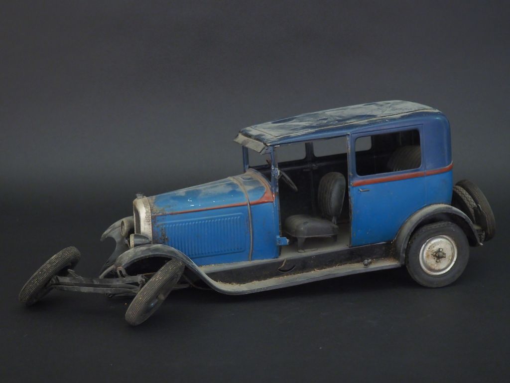 André CITROEN. Jouet en mauvais état Berline C6, bleu canard, filet brun (état pour restauration, manques dont une porte et essieux avant détaché) Expert : Murielle AUFFRET