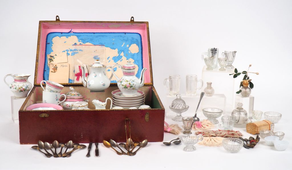 Dans un coffret de dînette ancien en mauvais état lot de porcelaine XIXème en état d'usage et incomplet partie de service à café et partie de service de table , on y joint un lot de verrerie et de serviettes Menu.