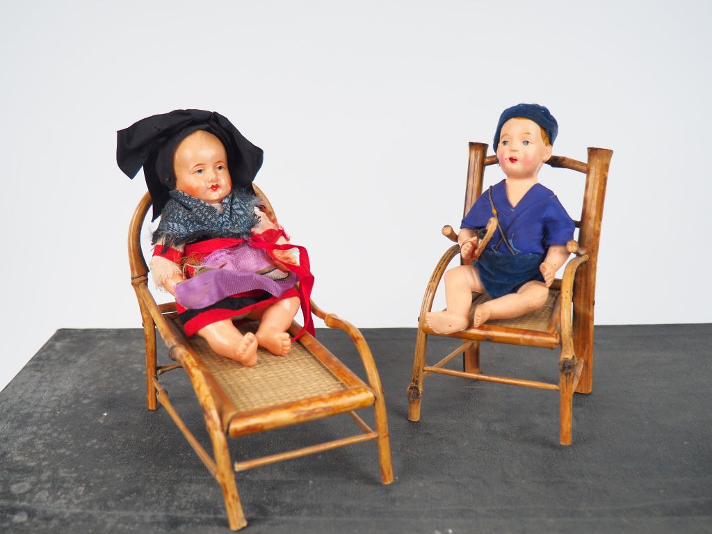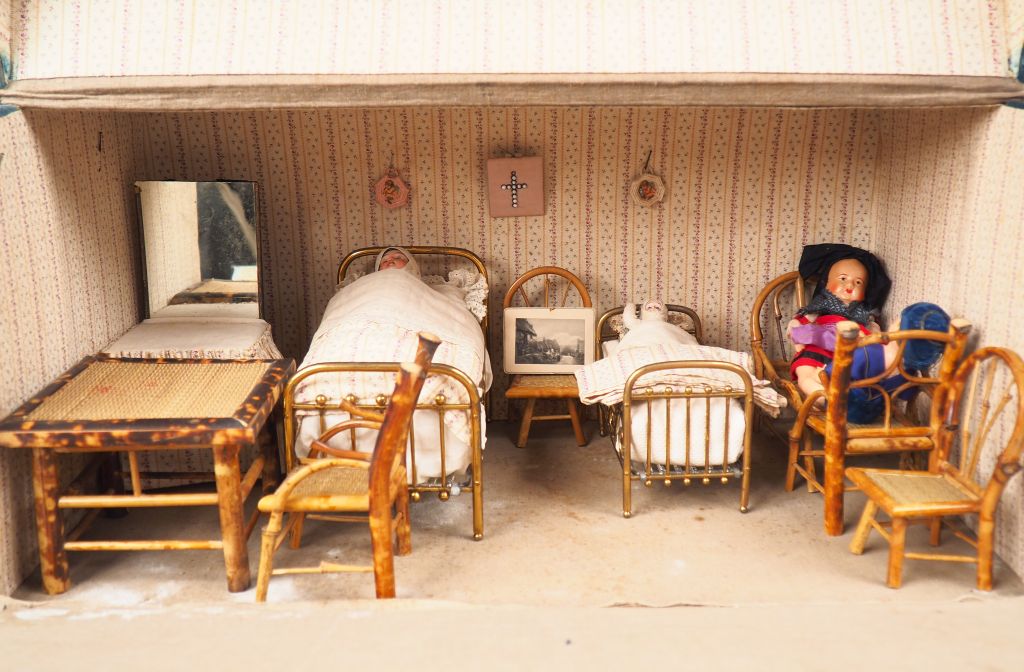 Dans une boite de rangement cartonnée et aménagée anciennement par le propriétaire une chambre de poupée comprenant un lot de mobiliers de poupée en rotin et en métal dont deux très jolis lits de fabrication allemande 1900, deux poupées à tête de porcelaine (il n’est possible de voir leur état vu leur vêtements) et 2 petits bébés celluloid.