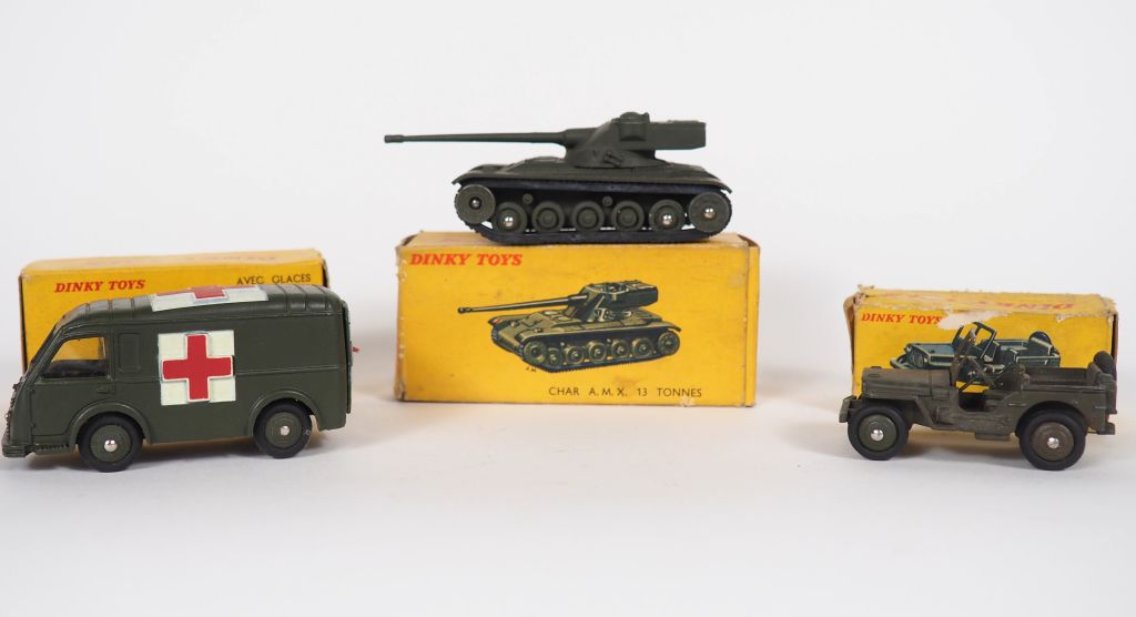 Dinky Toys France Lot de 3 véhicules militaires en boîte dont : char AMX 13 tonnes, jeep willys, ambulance militaire 80F véhicule en bon état d'usage boîte défraîchie