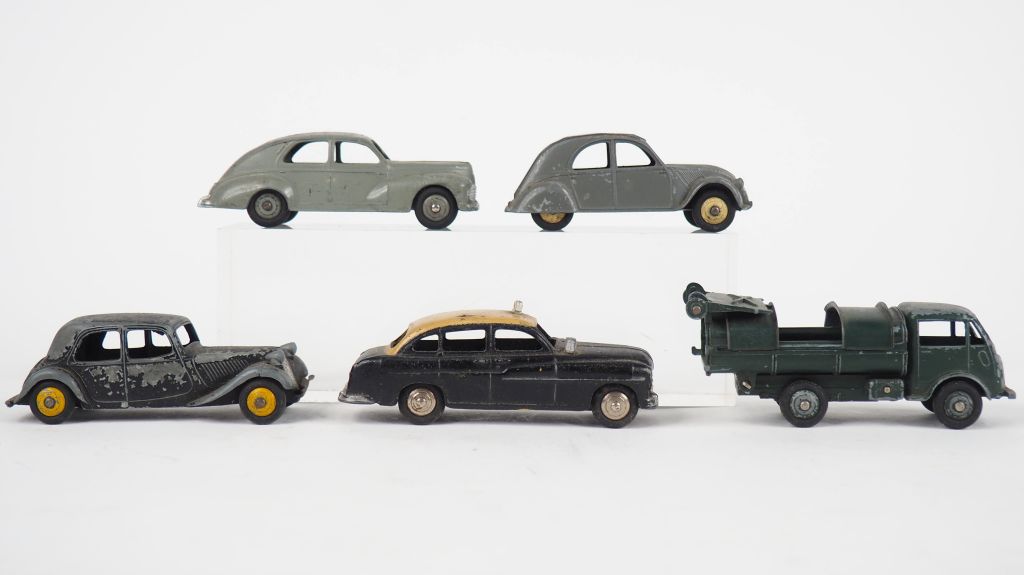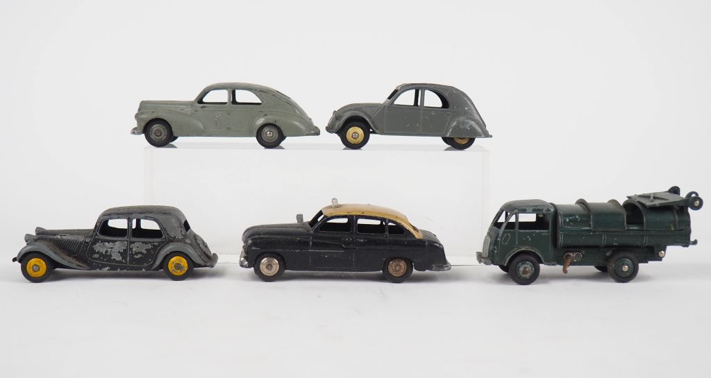Dinky Toys France lot de 5 véhicules dont : Taxi Ford vedette, Citroën 2CV, Citroën 11BL, camion benne, Peugeot 203 État d'usage