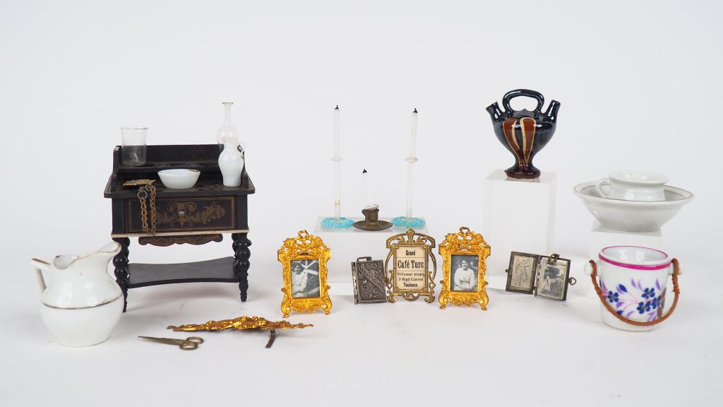 Eléments miniatures pour une maison de poupées dont porte photo, bougeoirs, pendentifs souvenir etc… le tout en état d’usage, on y joint une table de toilette et quelques pièces de service de toilette (petit broc accidenté).
