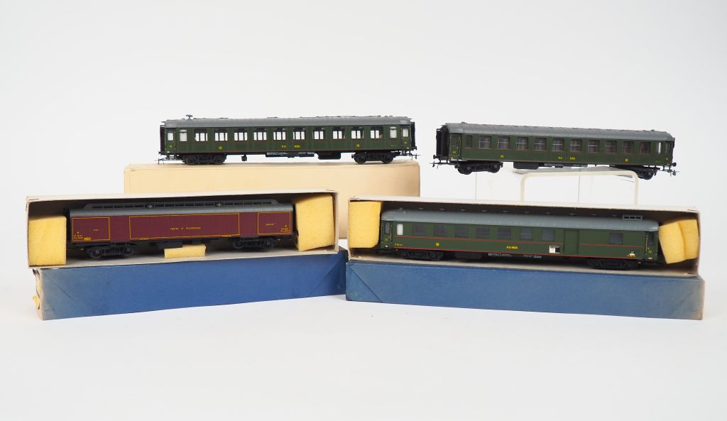 FRANCE TRAIN HO Matériel roulant lot de 3 voitures voyageurs PO Midi dont 1 en boite d’origine on y joint 1 fourgon postal en boite d’origine.