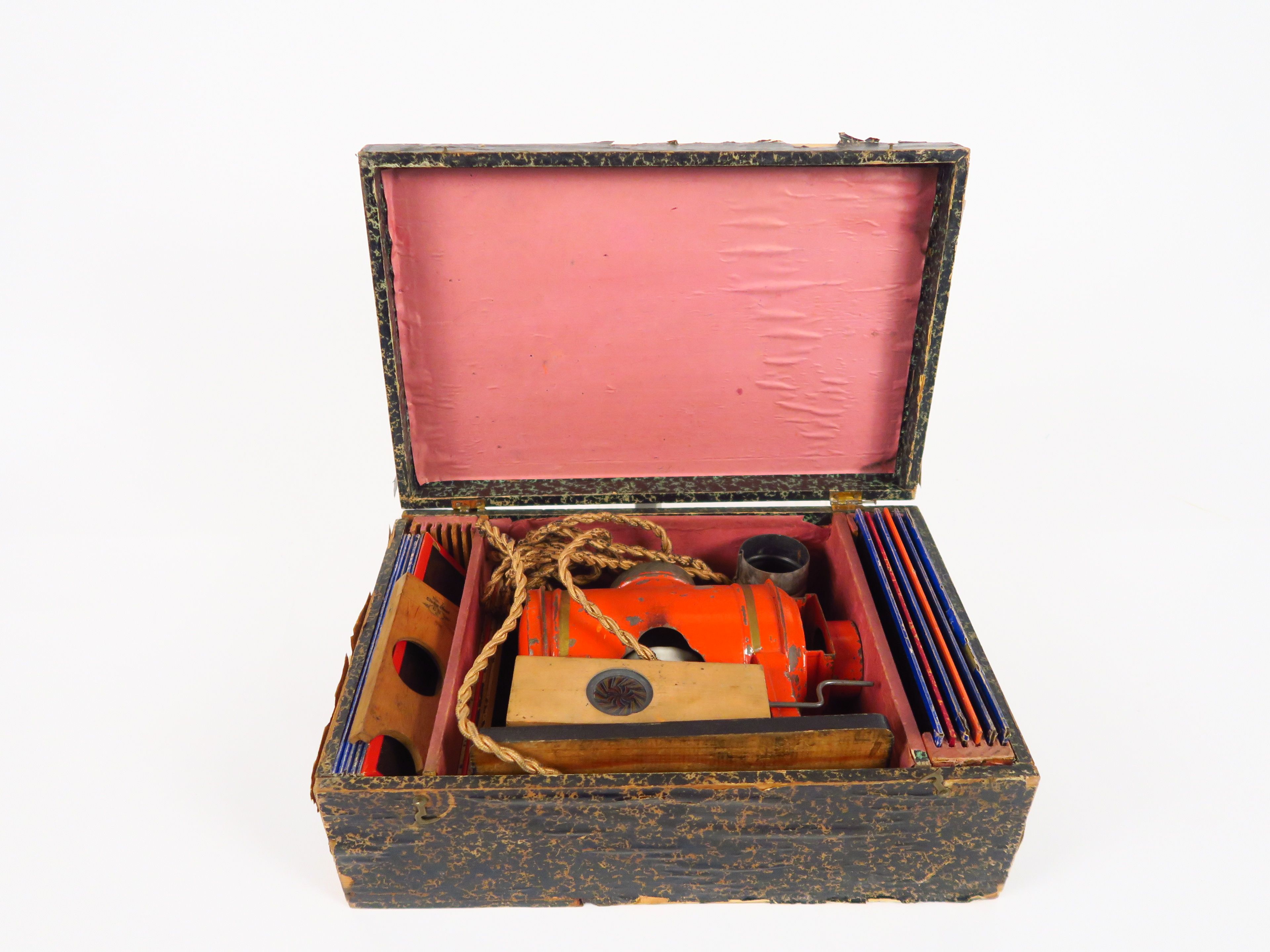 GBN. Lanterne magique avec plaque en coffret d'origine, fatiguée, caléidoscope et autres plaques. 12 pièces, état d'usage