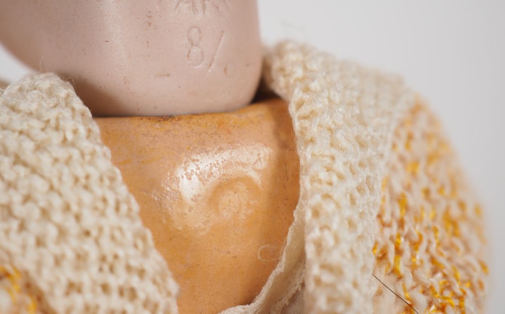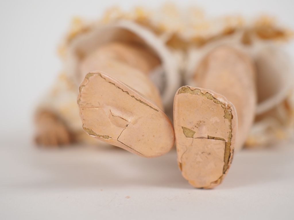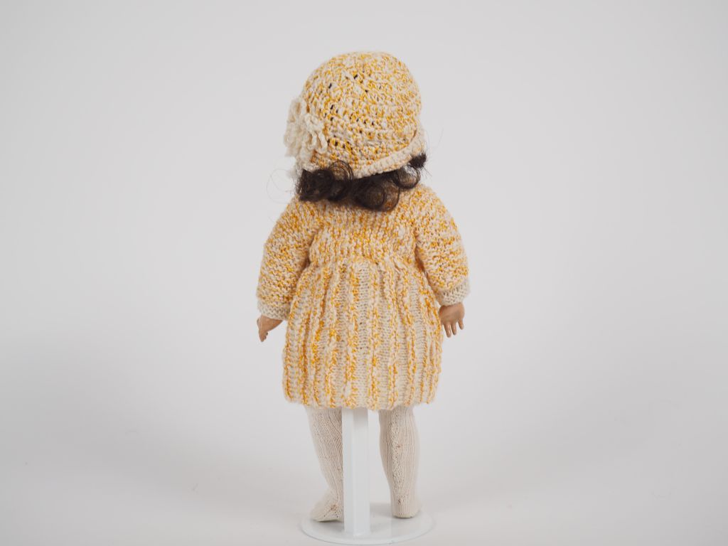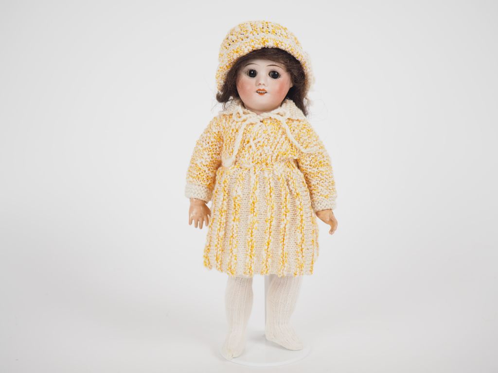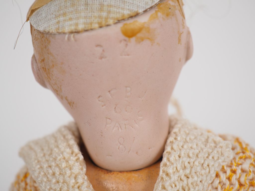 Jolie poupée type Bleuette SFBJ moule 60 8/0 tête porcelaine bouche ouverte yeux basculants bruns perruque ancienne cheveux naturels corps composition articulé marqué 1 sous les pieds et 2 entre les épaules. Taille 27 cm. A signaler des défauts de moule sur la porcelaine. Costume tricoté