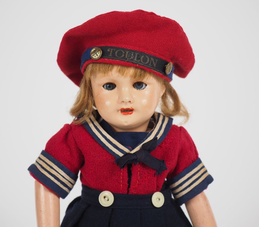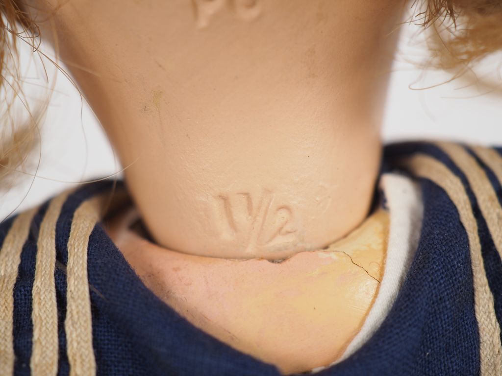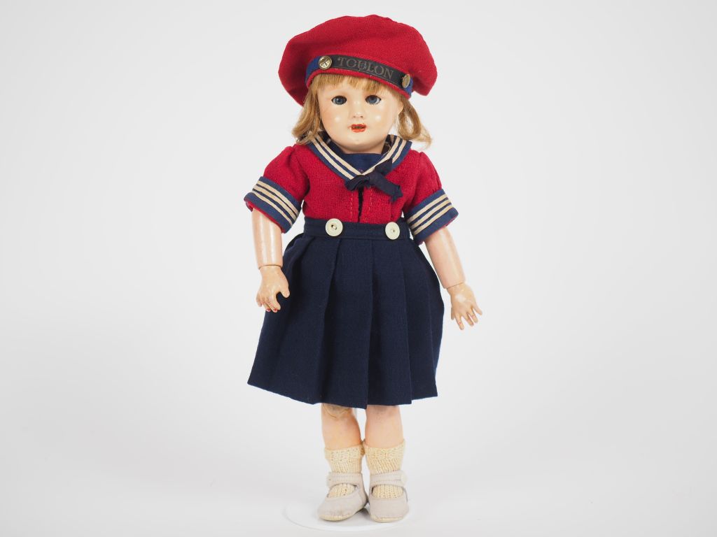 « La plus belle des Bleuette incassable » poupée Bleuette entièrement en composition bouche ouverte yeux basculants bleus, marqué 301 1 1/2 Pc, corps composition articulé marqué 1 sous le pied 2 entre les épaules. Circa aux alentours de 1936. Bon état général. Vêtements de marins en partie ancien veste Gautier-Languereau le reste restauré