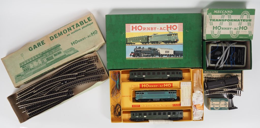 Lot de Hornby HO en boîte d'origine dont transformateur, rails, signaux lumineux et un coffret HO comprenant une motrice BB16009 avec voitures voyageur. Bel état.