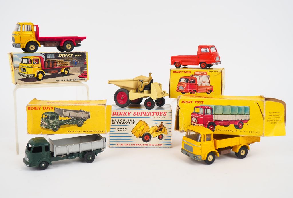 Lot de trois Dinky Toys en boîte d'origine ( boîte en mauvaise état et véhicule état d'usage) comprenant : - Simca Cargo - Basculeur-Automoteur -Camionîte. baché Berliet GAk ( manque la bache) On y joint 2 Dinky incomplets avec b