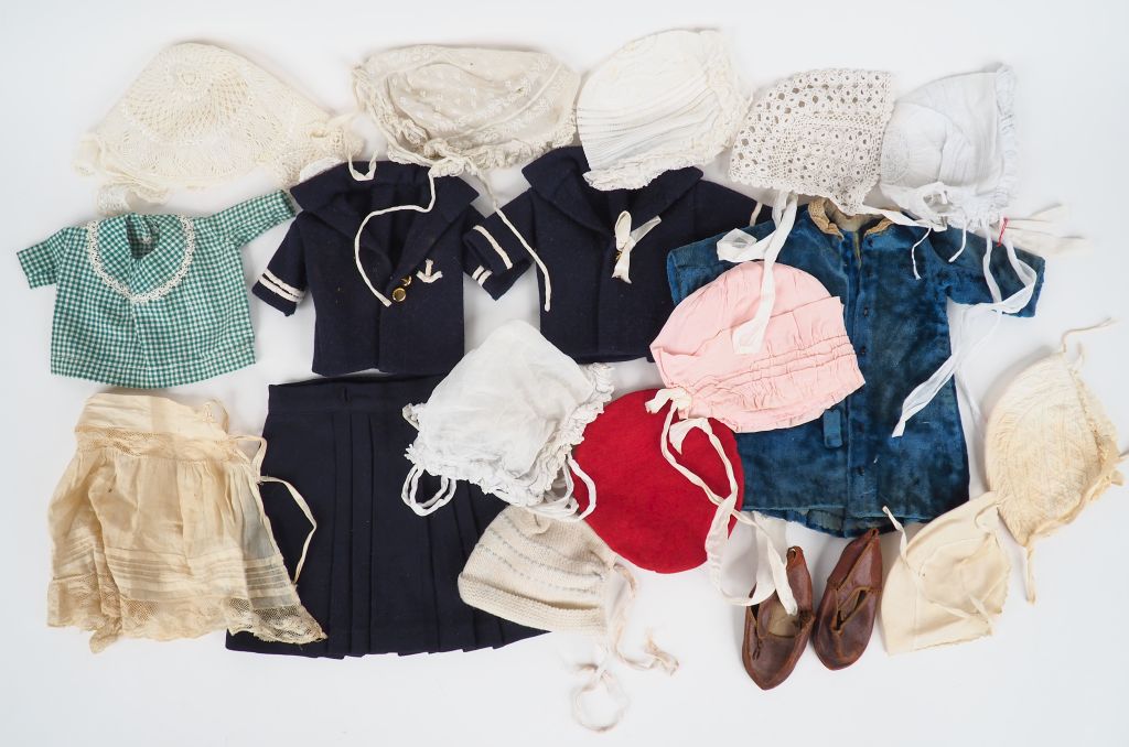 Lot de vêtements de poupées anciennes : 6 pièces on y joint une paire de chaussures anciennes T14 ainsi qu’un lot de 9 bonnets.
