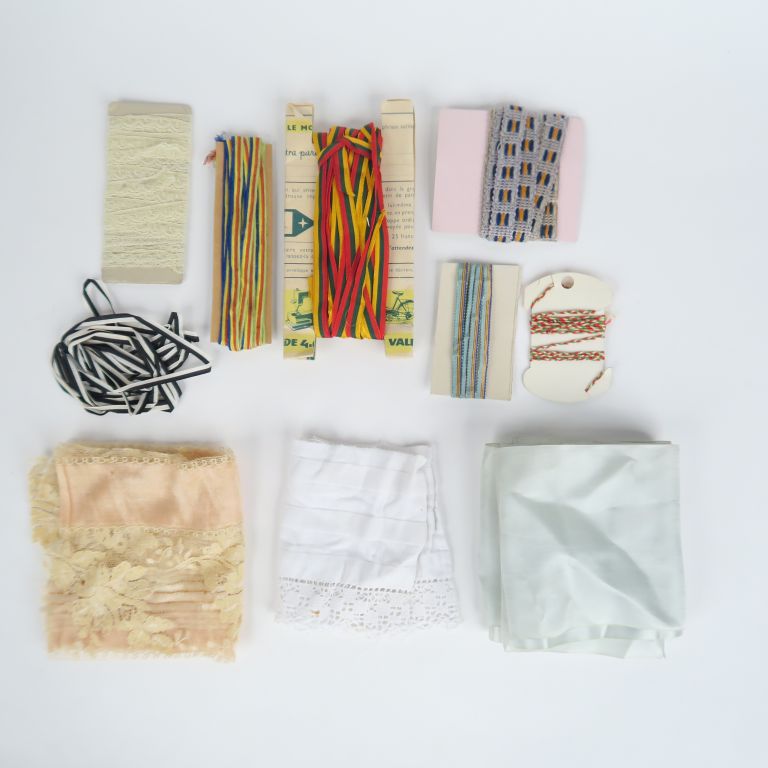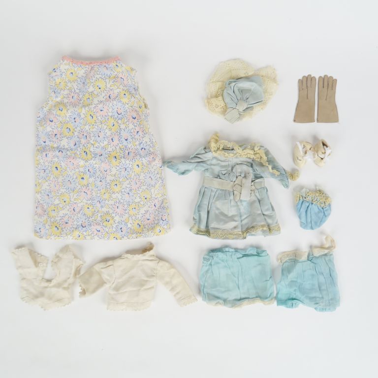Lot d’éléments pour réalisation de vêtement de poupée. On y joint un petit trousseau pour poupée taille 0 comprenant robe, chaussure sous-vêtements en mauvais état