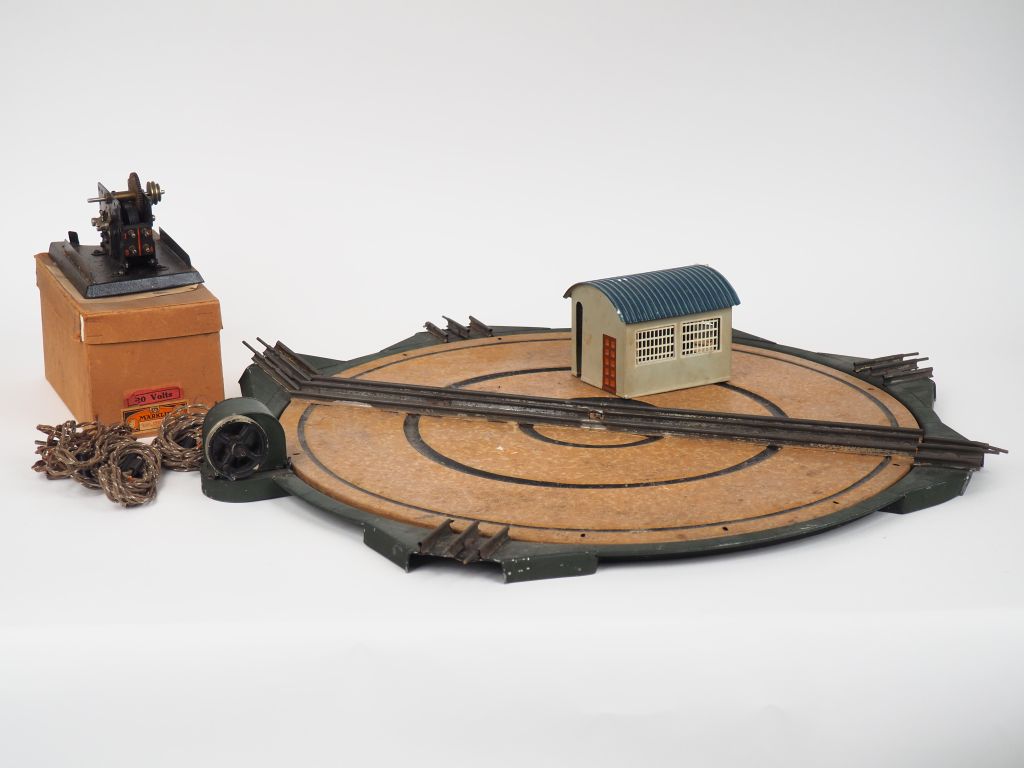 MARKLIN. Ecartement I. Grande plaque tournante avec cabane et moteur électrique, trace de repeint, déformations.