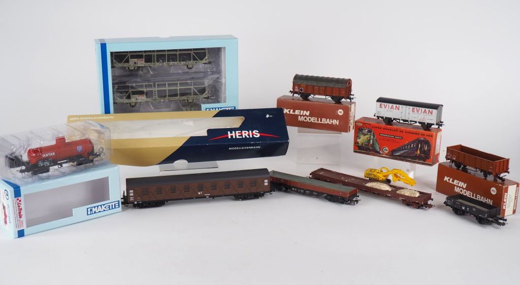 Matériel roulant de diverses marques dont Wagons de marchandises en boite de marques MAKETTE , KLEIN Modellbahn , SMCF en BE d’usages on y joint 3 wagons de marchandises en état d’usage et wagon atelier de chez Héris en BO au total 9 pièces