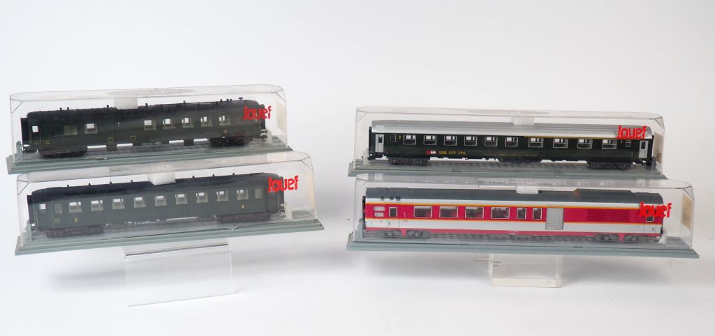 Matériel roulant de marque jouef HO 4 pièces en boîte cristal bel état donc voiture Rivets 2e classe voiture CFF 1ere/ 2e classe grand confort mixte première classe fourgon ETC …