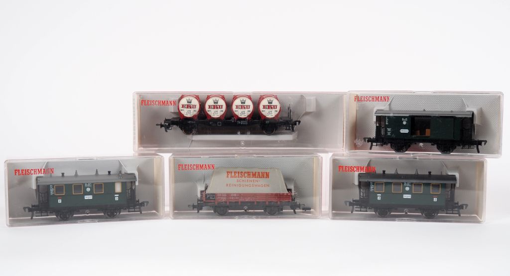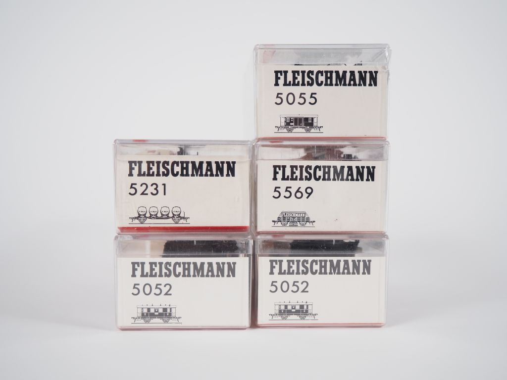 Matériel roulant en HO de marque FLEISCHMANN en boites cristal d’origine lot de 2 voitures voyageurs anciennes 2 essieux réf5052 et 3 wagons de marchandises divers réf 5055,5231,5569 BE d’usage
