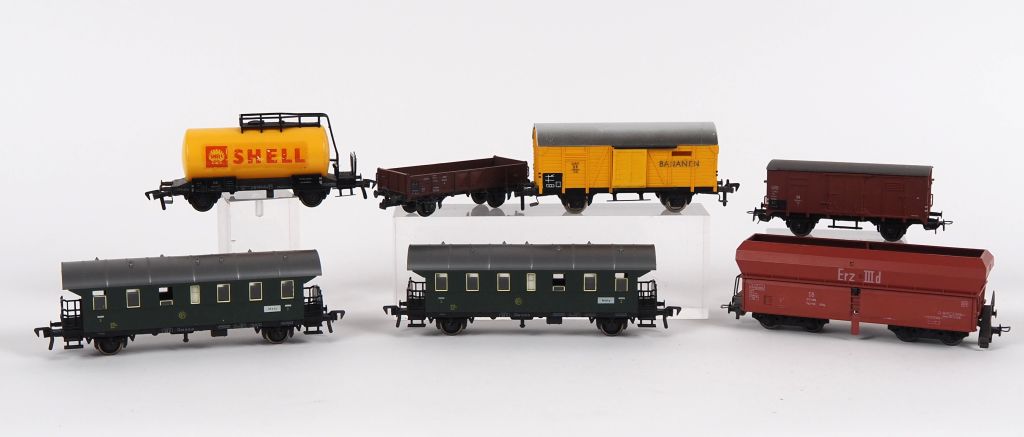 Matériel roulant en HO de marque FLEISCHMANN lot de 7 wagons divers dont citerne, couverts, trémie BE d’usage